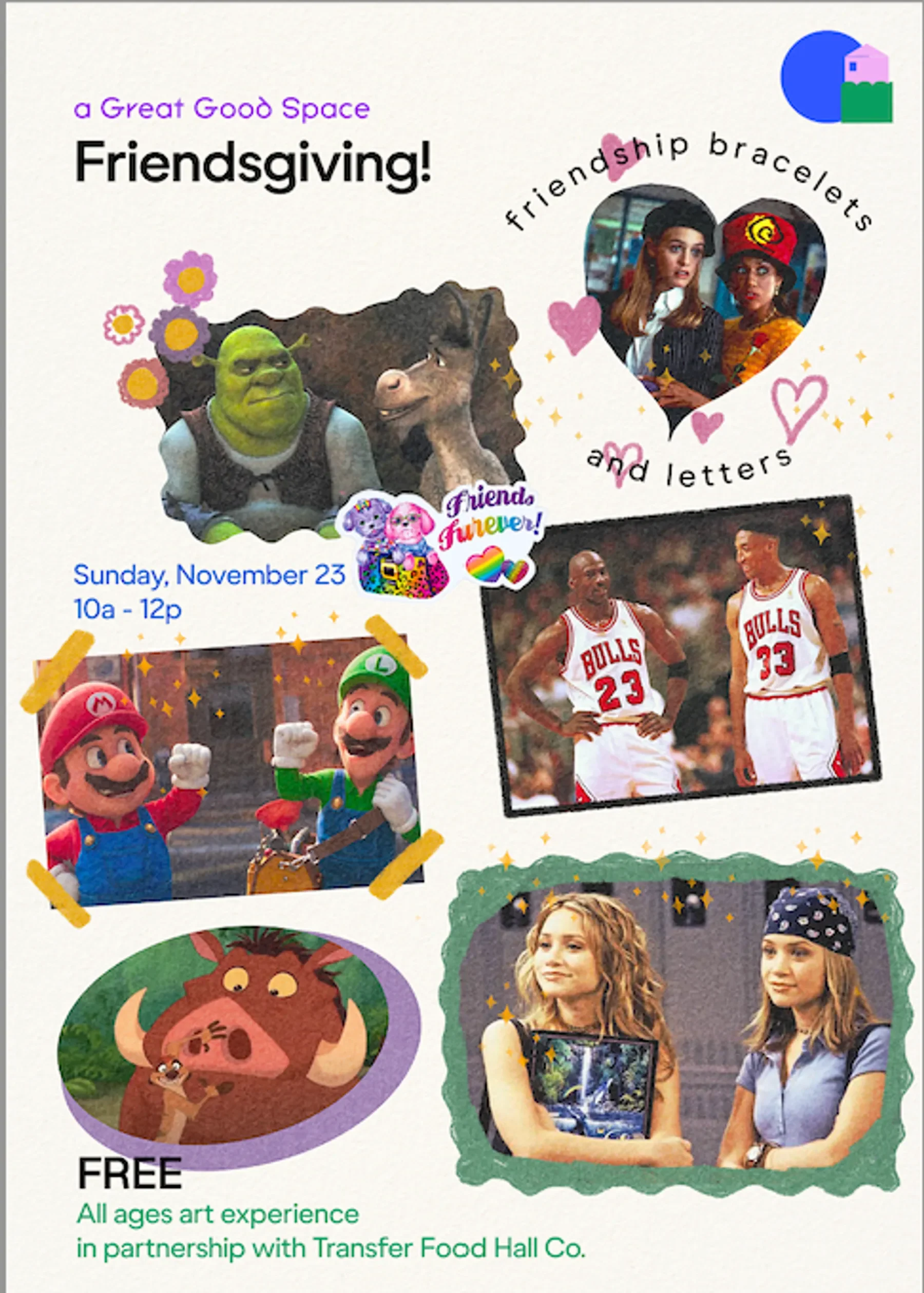 It’s Friendsgiving time, and we’re all about celebrating the simple joy of being together! 💛 Come hang out at Transfer Co. Food Hall with A Great Good Space for a morning of crafting, laughter, and connection. We’ll have everything you need — beads, string, markers, and all the friendship bracelet magic you could ask for. Make a bracelet (or three), snap some silly print-out photos, and write a note to someone who makes your world brighter. Bring your bestie, your brunch crew, or come solo and make a new friend — everyone’s welcome!