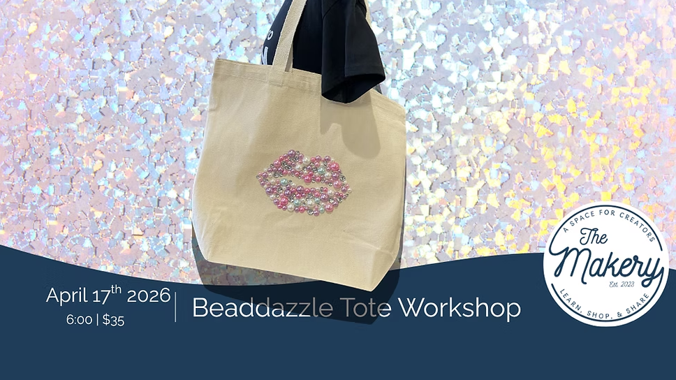 Back to All Events Beaddazzle Tote Workshop Friday, April 17, 2026 6:00 PM 8:00 PM The Makery 317 East Roosevelt Avenue Wake Forest, NC, 27587 United States (map) Google Calendar ICS In this fun, hands-on workshop, you’ll design your own beadazzled tote bag using a mix of beads, embellishments, and creative techniques to make something totally unique. Whether you go bold and colorful or keep it chic and minimal.COST: $35 register